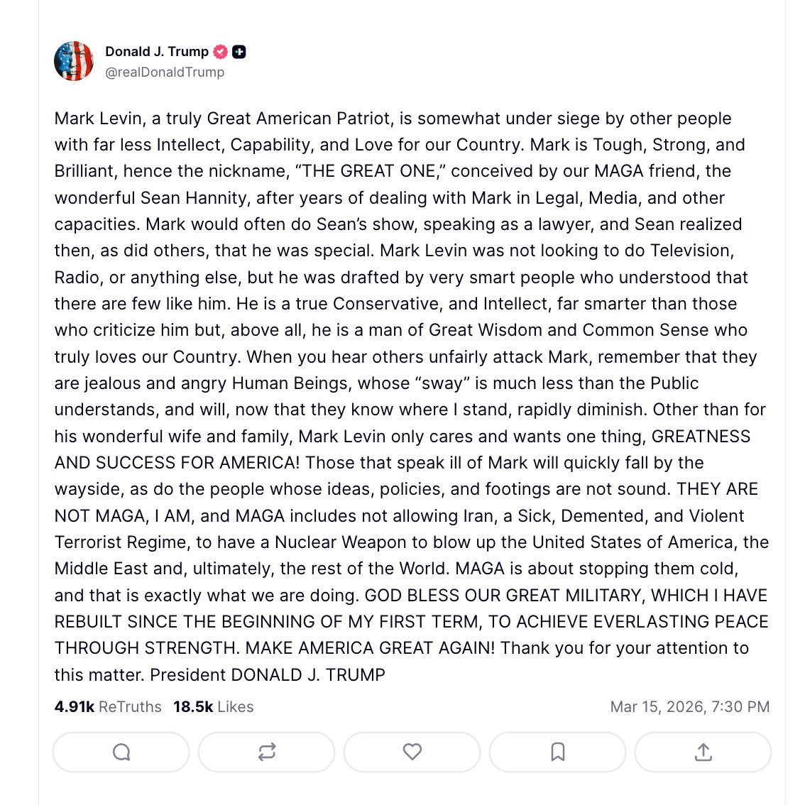 Mark Levin, a truly Great American Patriot, is somewhat under siege by other people with far less Intellect, Capability, and Love for our Country. Mark is Tough, Strong, and Brilliant, hence the nickname, “THE GREAT ONE,” conceived by our MAGA friend, the wonderful Sean Hannity, after years of dealing with Mark in Legal, Media, and other capacities. Mark would often do Sean’s show, speaking as a lawyer, and Sean realized then, as did others, that he was special. Mark Levin was not looking to do Television, Radio, or anything else, but he was drafted by very smart people who understood that there are few like him. He is a true Conservative, and Intellect, far smarter than those who criticize him but, above all, he is a man of Great Wisdom and Common Sense who truly loves our Country. When you hear others unfairly attack Mark, remember that they are jealous and angry Human Beings, whose “sway” is much less than the Public understands, and will, now that they know where I stand, rapidly diminish. Other than for his wonderful wife and family, Mark Levin only cares and wants one thing, GREATNESS AND SUCCESS FOR AMERICA! Those that speak ill of Mark will quickly fall by the wayside, as do the people whose ideas, policies, and footings are not sound. THEY ARE NOT MAGA, I AM, and MAGA includes not allowing Iran, a Sick, Demented, and Violent Terrorist Regime, to have a Nuclear Weapon to blow up the United States of America, the Middle East and, ultimately, the rest of the World. MAGA is about stopping them cold, and that is exactly what we are doing. GOD BLESS OUR GREAT MILITARY, WHICH I HAVE REBUILT SINCE THE BEGINNING OF MY FIRST TERM, TO ACHIEVE EVERLASTING PEACE THROUGH STRENGTH. MAKE AMERICA GREAT AGAIN! Thank you for your attention to this matter. President DONALD J. TRUMP